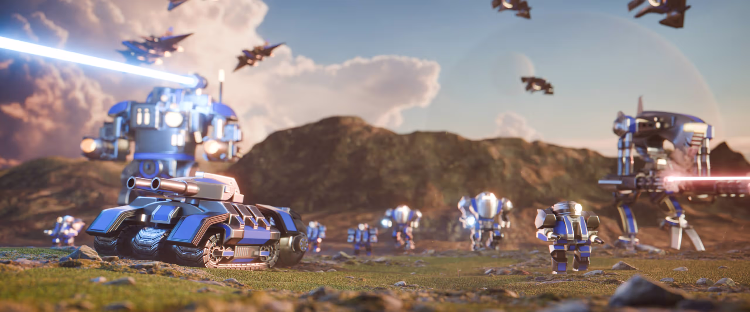 All units and projectiles are simulated in real-time. The game offers fully simulated projectile ballistics, explosion physics and terrain deformation.
