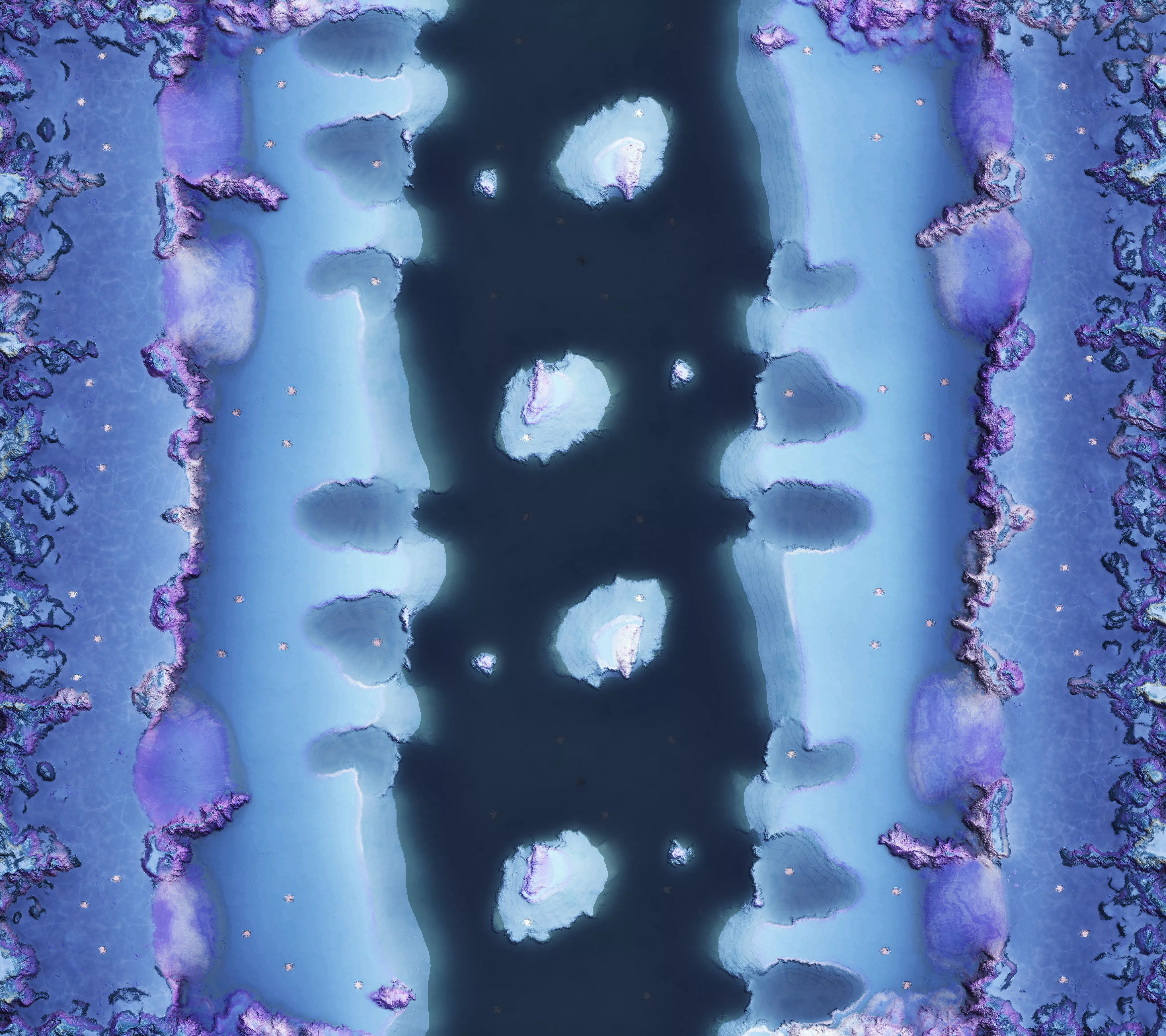 Four islands across a blue bay divide sandy beaches and brilliant crystal plateaus.