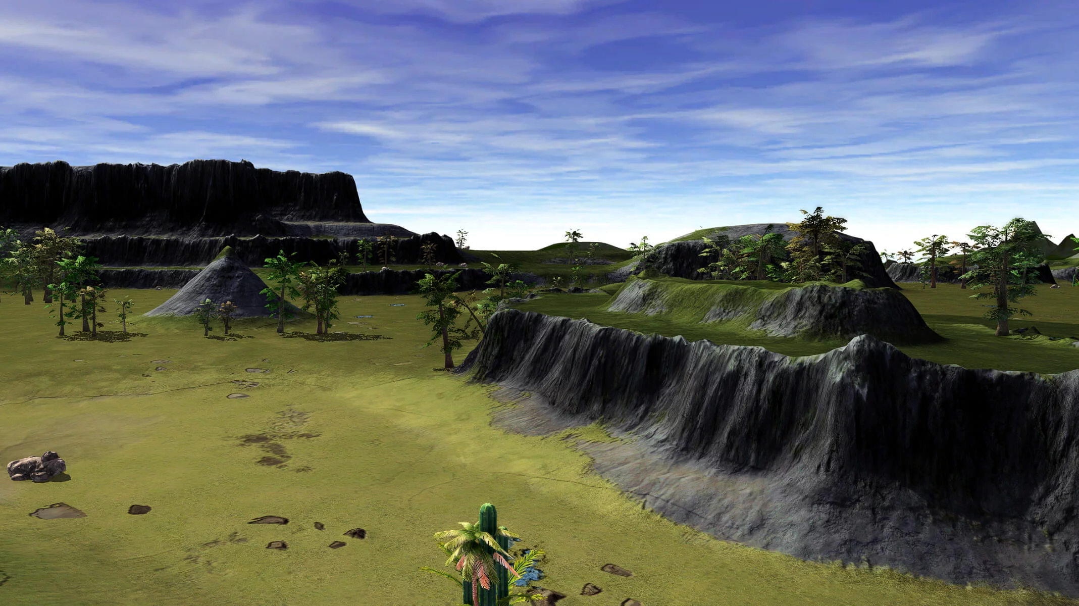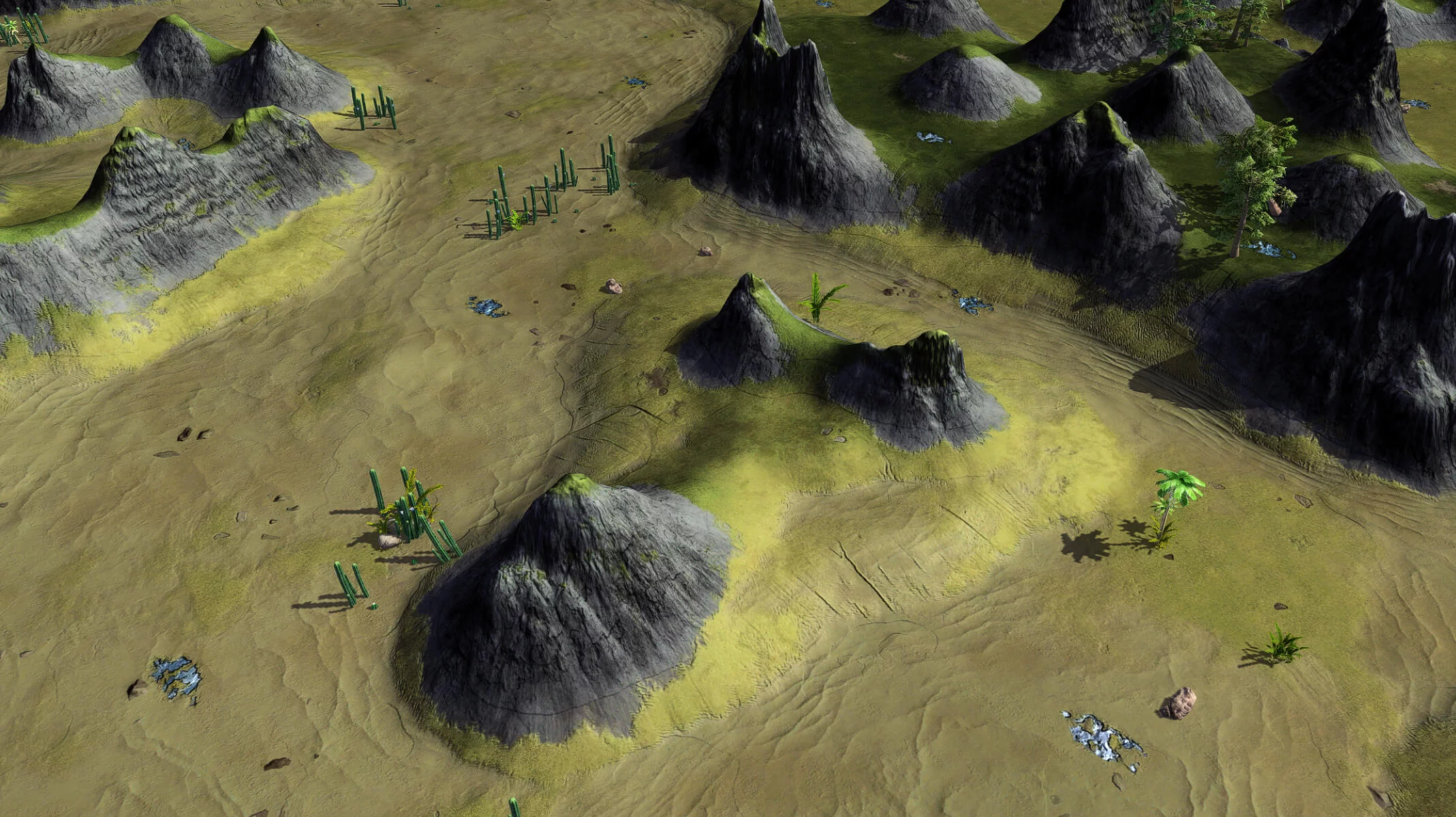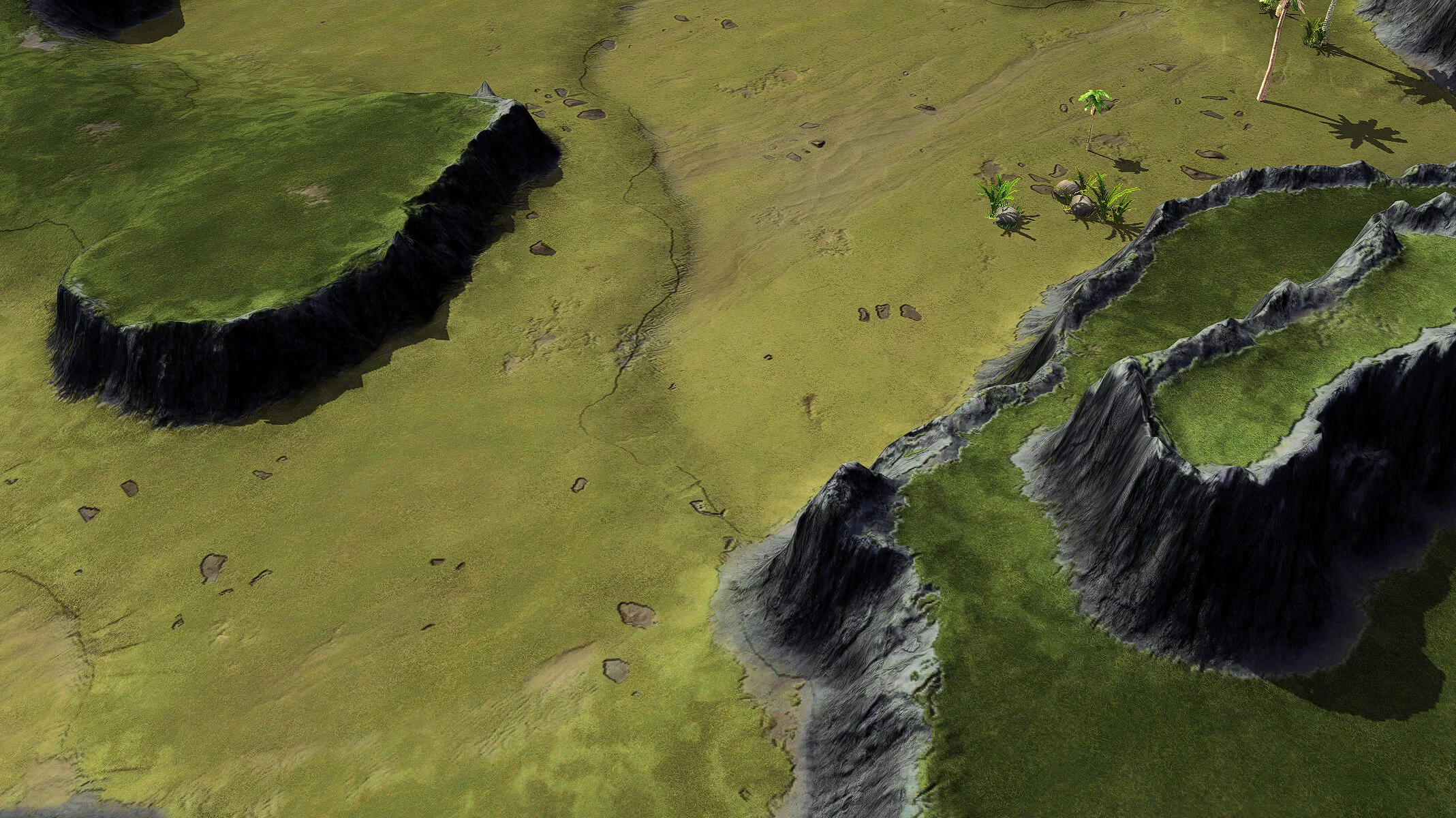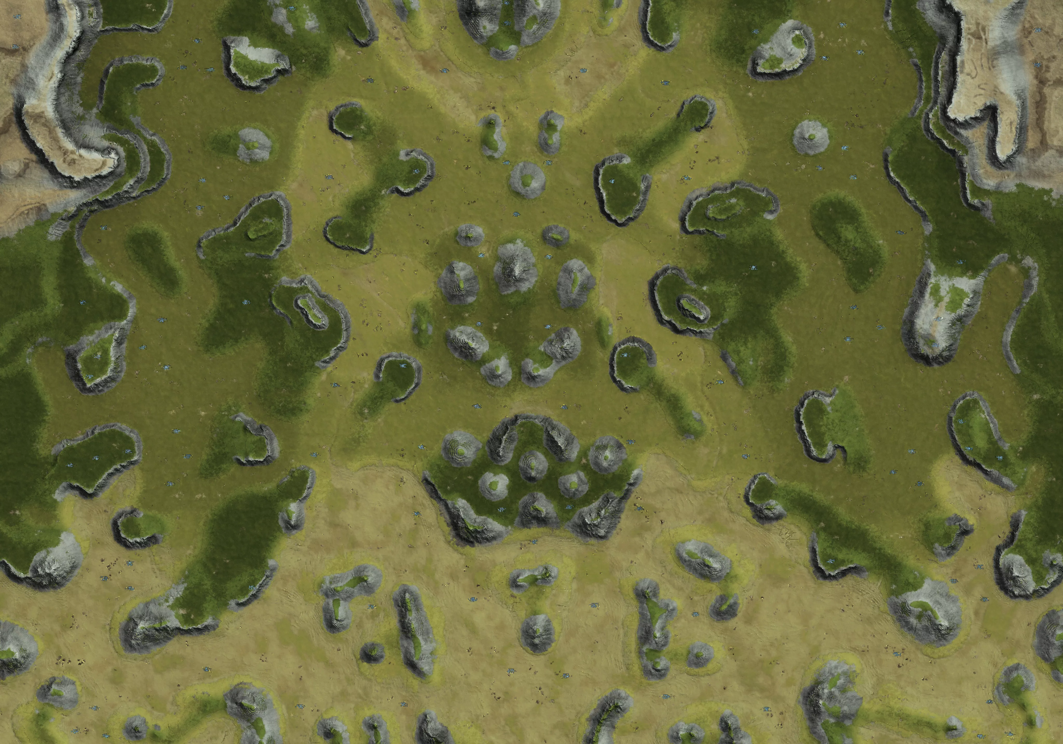 Large map with start positions supporting up to 9 players per team. Variations of more and less open terrain with small hills. Securing hills helps to control parts of the map. Both kbots and vehicles are valid options to win.