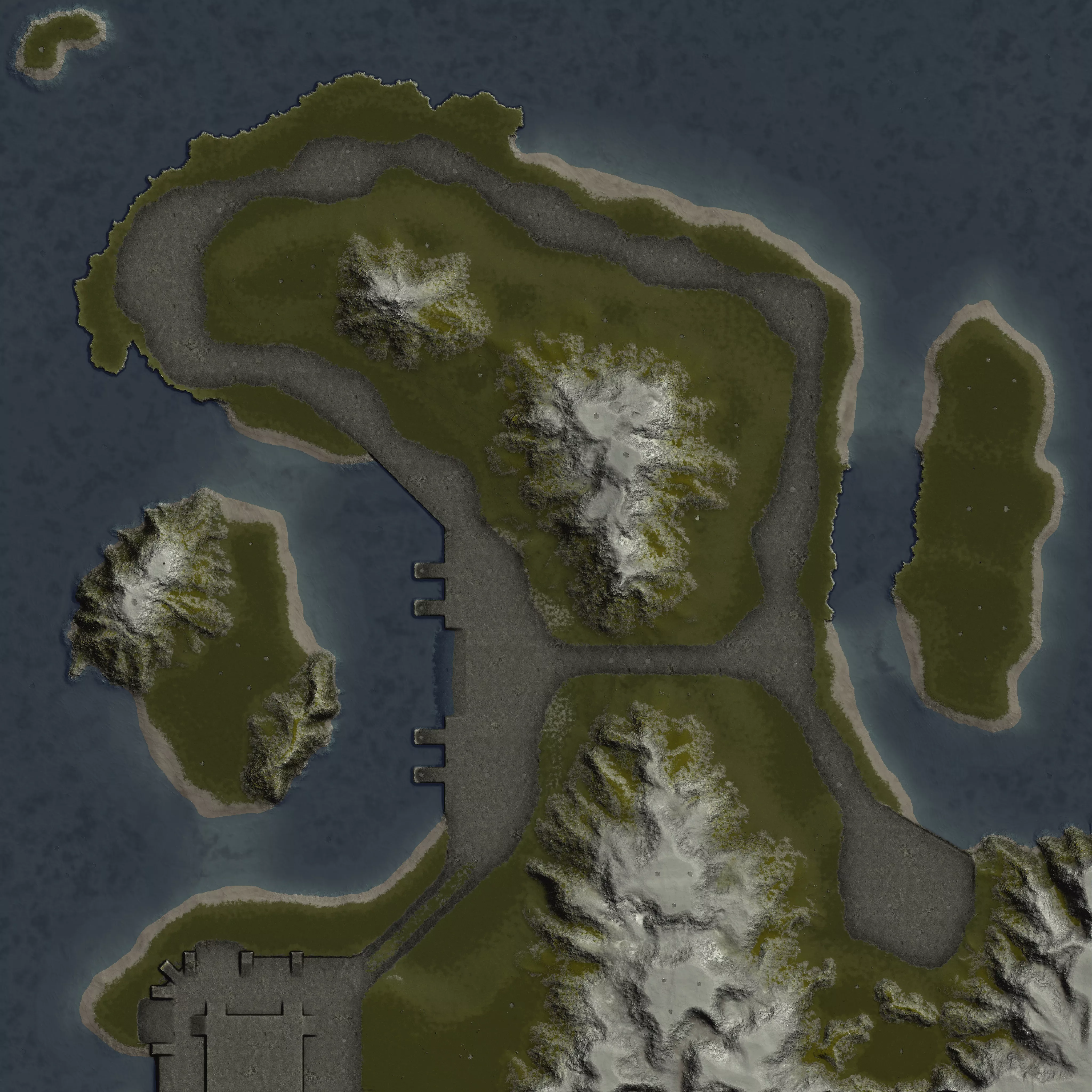 Large assymetric map with roads and ruins.