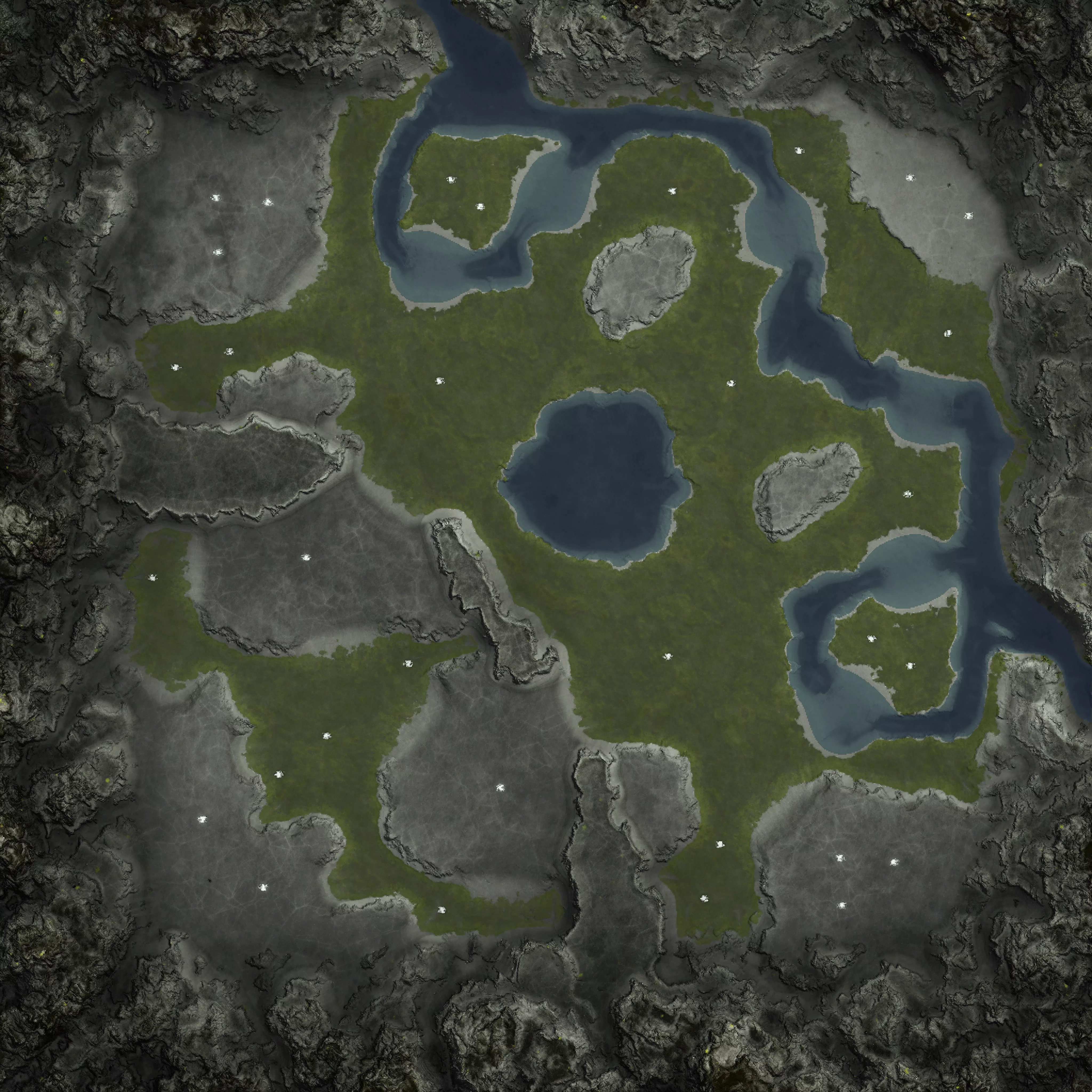 An arena of dark crystal plateaus rise above a winding river.