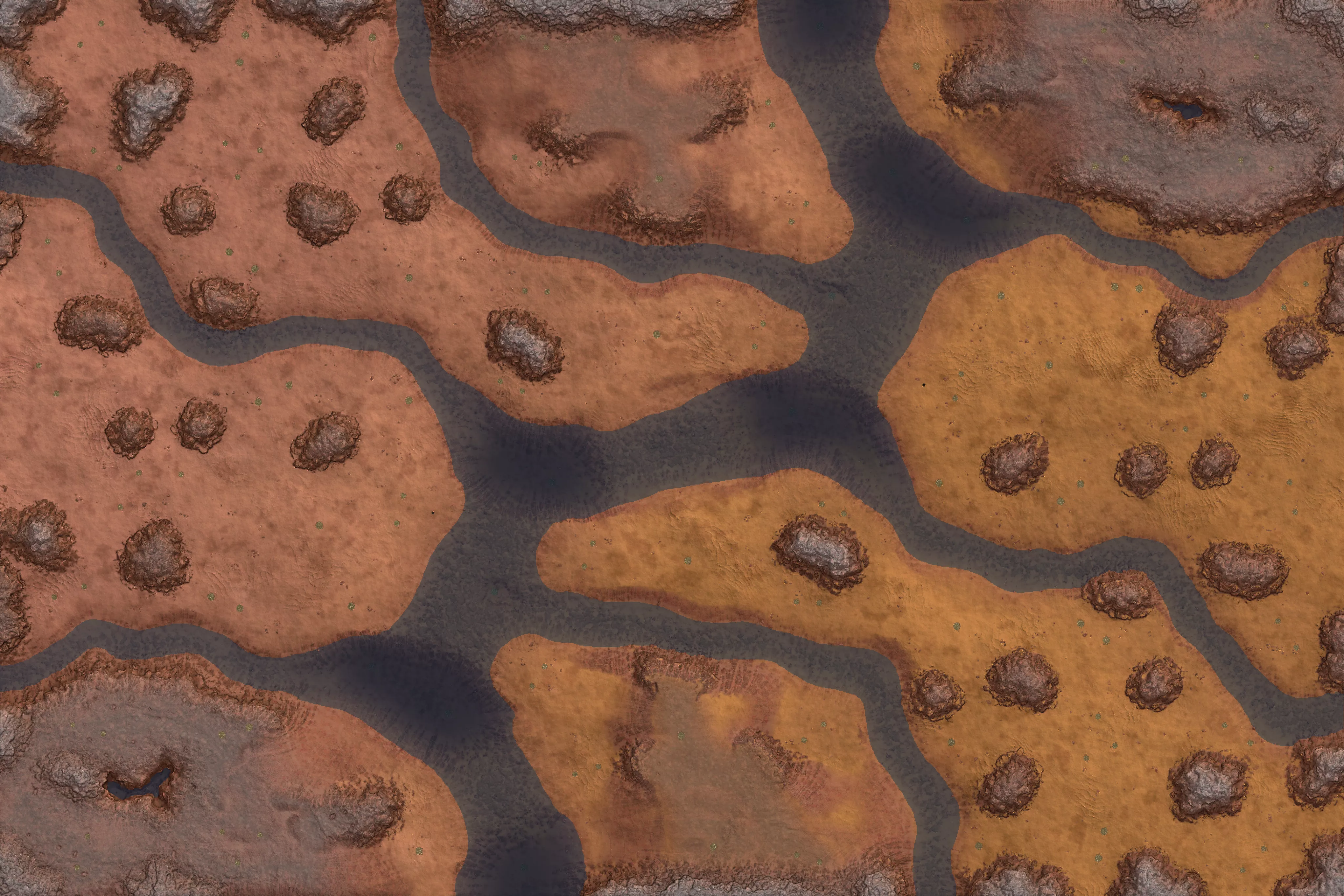Large desert hills are separated by wide river.